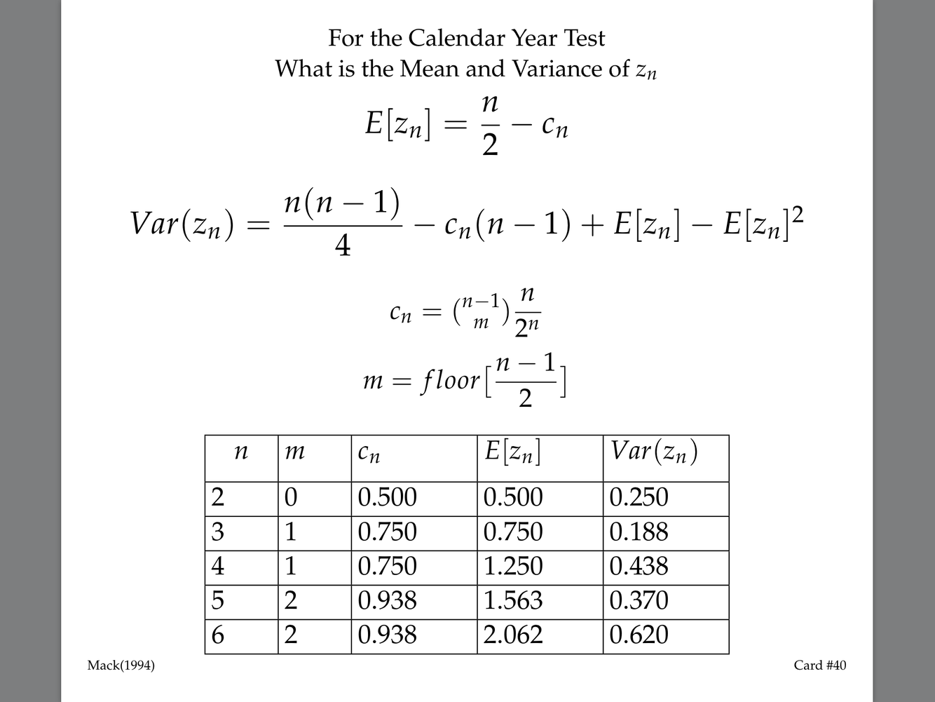 For the calendar year test, what is the mean and variance of Zn?