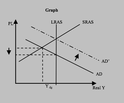 Self correcting mechanism will bring the economy back to equilibrium because of the wage price flexibility. Therefore people will work for less, so production gets cheaper, so short run aggregate supply increases. The economy will always go back to equilibrium in the long run. We come out of the gap at a lower price level. Graph: SRAS moving down and to the right.
