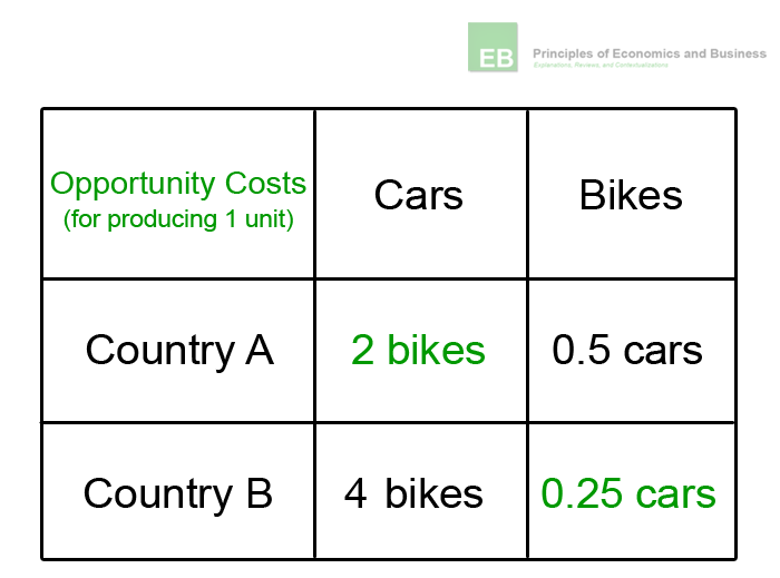When a country can produce a good or service at a lower opportunity cost. Even if it has an absolute advantage in both goods, if country A produces a car it has to spend 10 hours that could have been used to work on the bikes. In fact, it could have instead assembled 2 bikes (since it only takes 5 hours to build a bike). Obviously the same goes for producing a bike. The time spent finishing one bike could have alternatively been used to build half a car. If we apply this to country B, we can see that the time spent producing one car could have been used to finish 4 bikes. Meanwhile, one bike has an opportunity cost of 0.25 cars. Hence, country A has a comparative advantage in producing cars, while country B has a comparative advantage in producing bikes (see table 2).