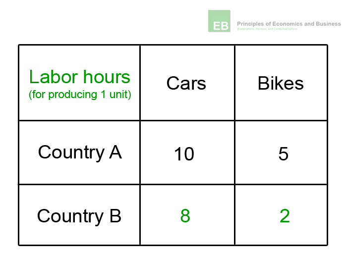 both countries have 2’000 labor hours available. If they both decided to allocate half of those resources to each product, country A could produce 100 cars and 200 bikes while country B could produce 125 cars and 500 bikes. This would result in a total output of 925 units