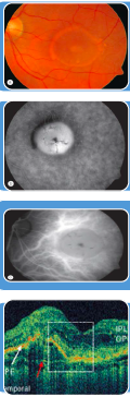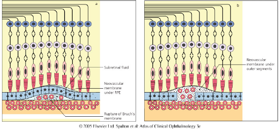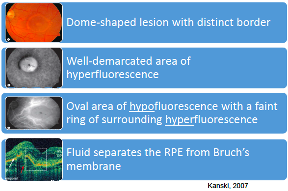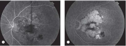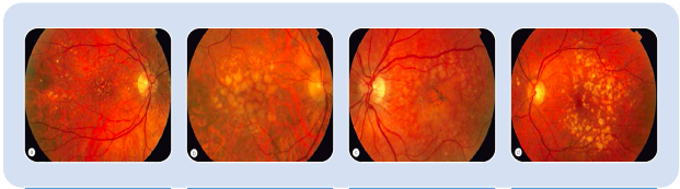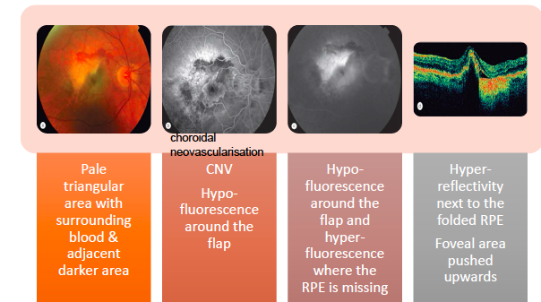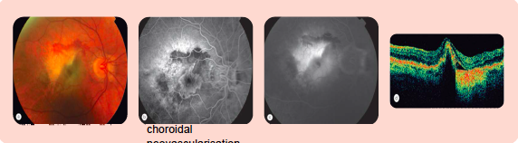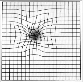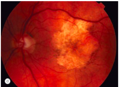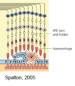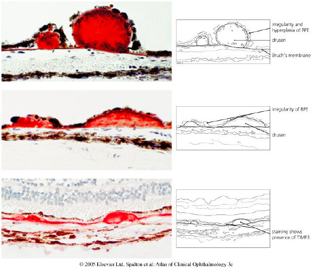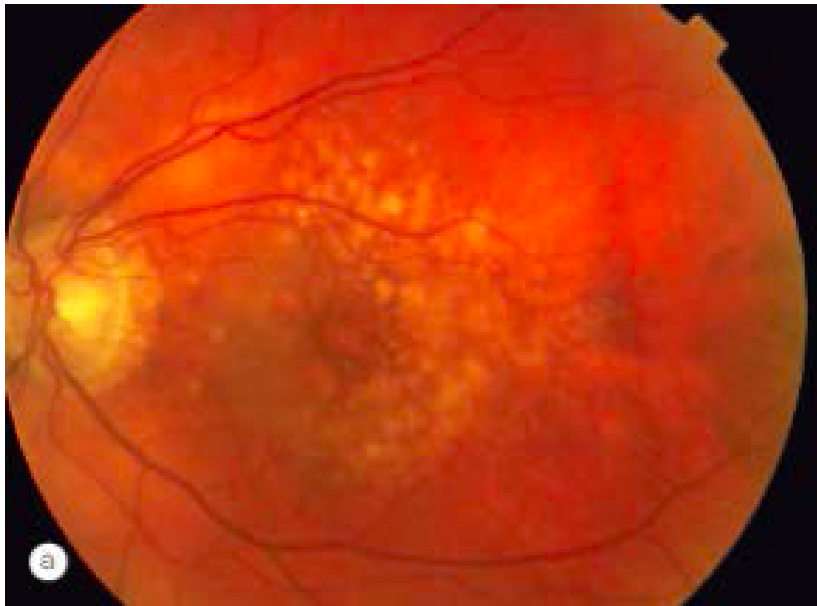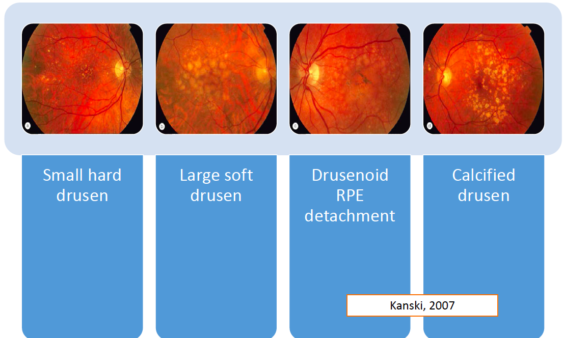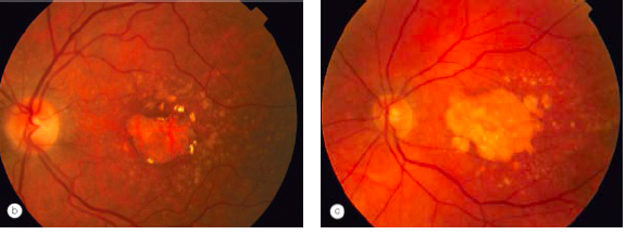 yellowish, atrophic , drusen not obvious, vision affected severely