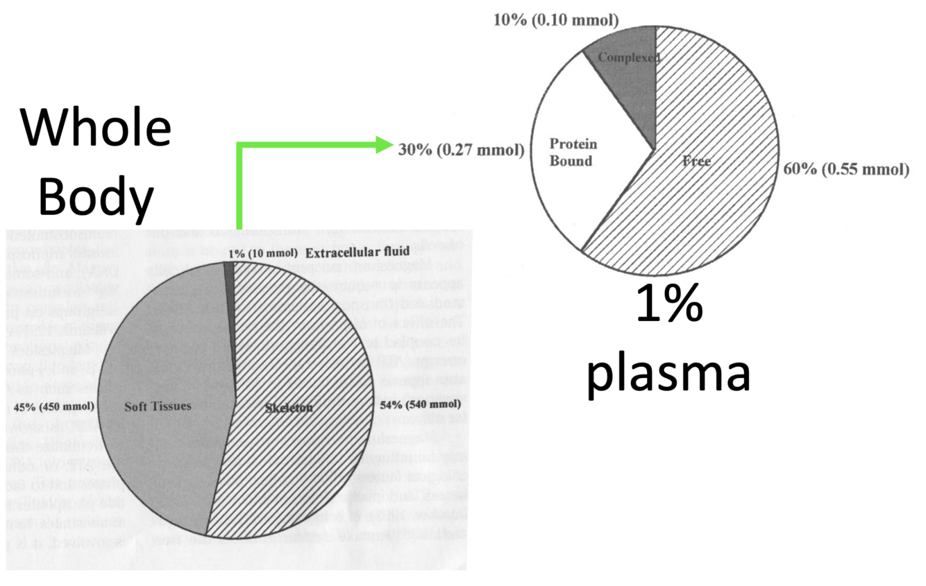 * 1% is extracellular and 0.6% is actually free ion in serum