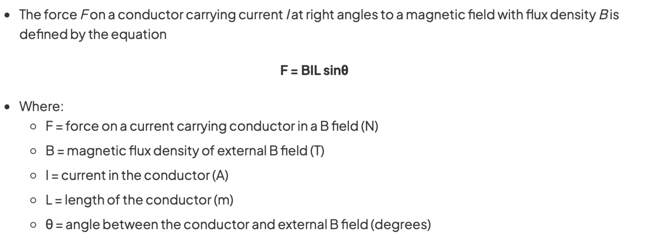 the greater the current or the magnetic field strength, the greater the force on the conductor
