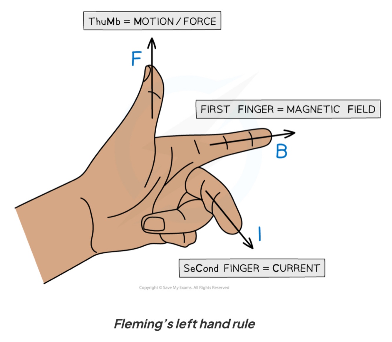 -Using Fleming’s left-hand rule, the first finger points into the page and the second finger (current) points to the right