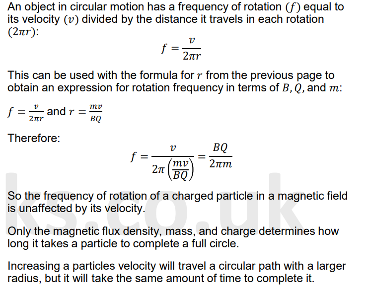 The particles will always spend the same amount of time in each electrode or cross the gap at the same time since the frequency of circular motion is independent of radius. The alternating p.d. will have a constant frequency if ๐ต,๐, and ๐ are constant.