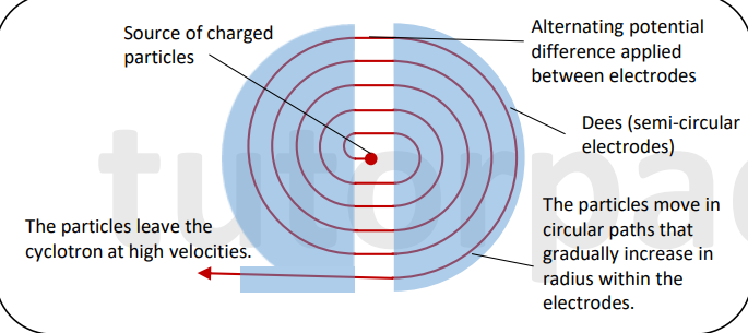 The direction of the p.d. will have been reversed when the particles enter the next electrode (i.e. the charge of the electrodes will switch so that the negative electrode will now be the positive electrode or vice versa, attracting the particle), and the particle will accelerate again before entering the next electrode. The process repeats as the particles spiral outwards, increasing in speed, before eventually exiting the cyclotron.