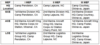 The MEF is the Marine Corps’ principal warfighting organization. It is capable of missions across a range of military operations to include amphibious assault and sustained operations ashore in any environment. Size and composition can vary greatly depending on the requirements of the mission. The major commands that constitute the primary reservoir of combat capabilities are: