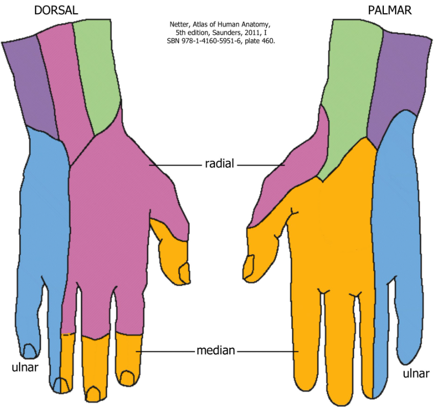 Pouce, index, majeur, et la moitié radiale du 4e
