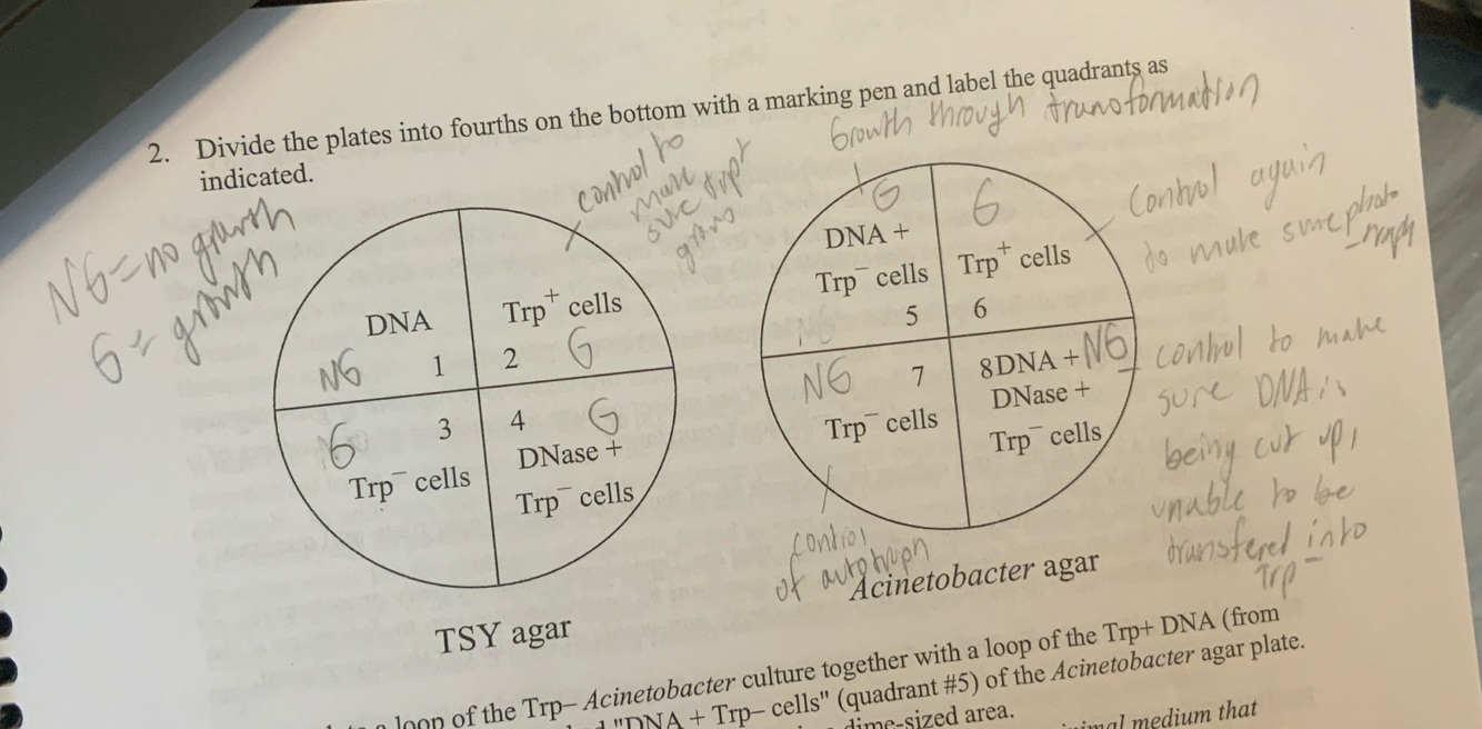 Acinetobacterium doesn’t supply Trp, and only Trp- that uptakes DNA from lyse cell will grow, and of course Trp+ will grow fine cause it already has it. DNase will kill DNA in that quadrant,