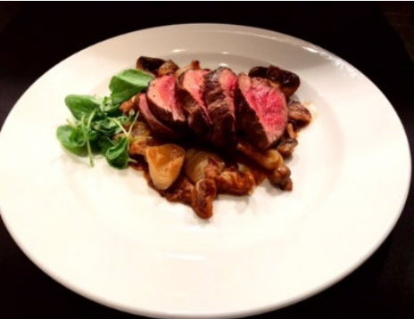 SLICED FILET MIGNON WITH CIPOLLINI ONIONS, WILD MUSHROOMS AND FIG
