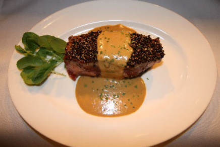 carved in house, encrusted with crushed black peppercorns, and seared; finished with a Courvoisier cognac cream sauce.