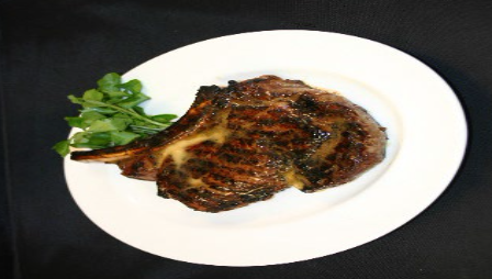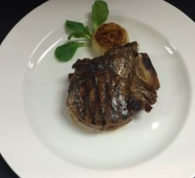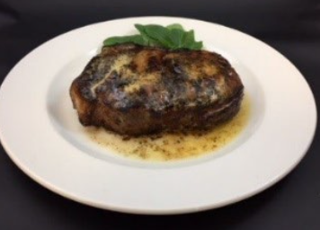 16 -18 oz. Veal rib chop lightly broiled and roasted to medium. Finished with