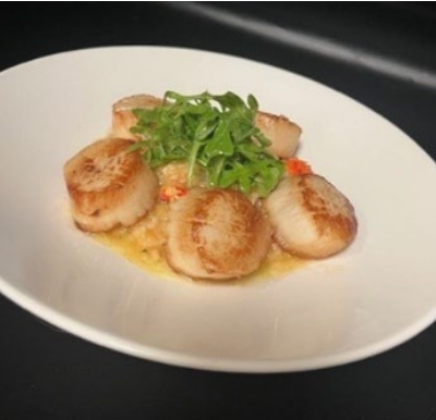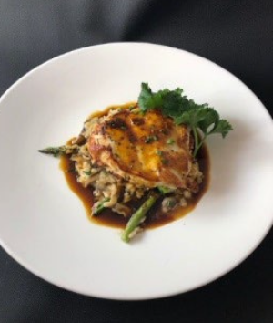 5 sea scallops pan seared and served atop a bed of creamy asparagus and Maine lobster risotto. The dish is finished with arugula tossed in lemon oil.