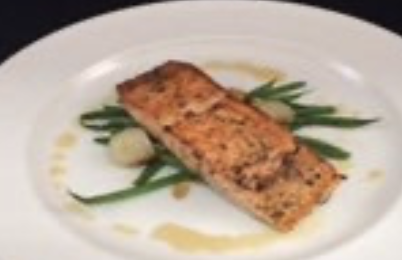 SEARED CITRUS GLAZED SALMON WITH MARCONA ALMONDS AND BROWN