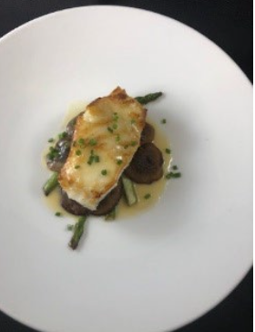 Pan-seared Chilean Sea Bass served with Shiitake Mushrooms, Asparagus, and Miso Butter Sauce.