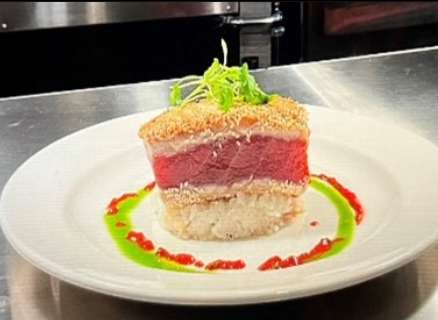 (8 oz. tuna steak dinner and 6 oz. lunch) lightly dusted with sesame seeds, seared, over a bed of gingered rice.