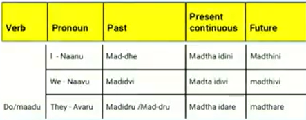 Summary table showing how the verb to do (maadu) changes with past, present and future for I, we, they