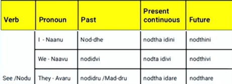 Summary table showing how the verb to see (nodu) changes with past, present and future for I, we, they