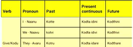 Summary table showing how the verb to give (kodu) changes with past, present and future for I, we, they