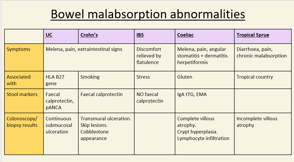 Summarise the different conditions causing bowel malabsorption abnormalities.