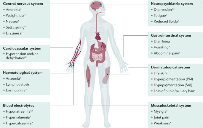 - Pigmentation des mains et de la bouche (du à l’accumulation d’ACTH qui contient la séquence peptidique de la MSH) (primaire)