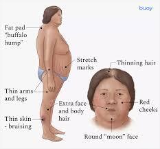 Généraux : prise de poids rapide et obésité centrale, face lunaire (rond et rouge), bosse de bison au niveau du cou