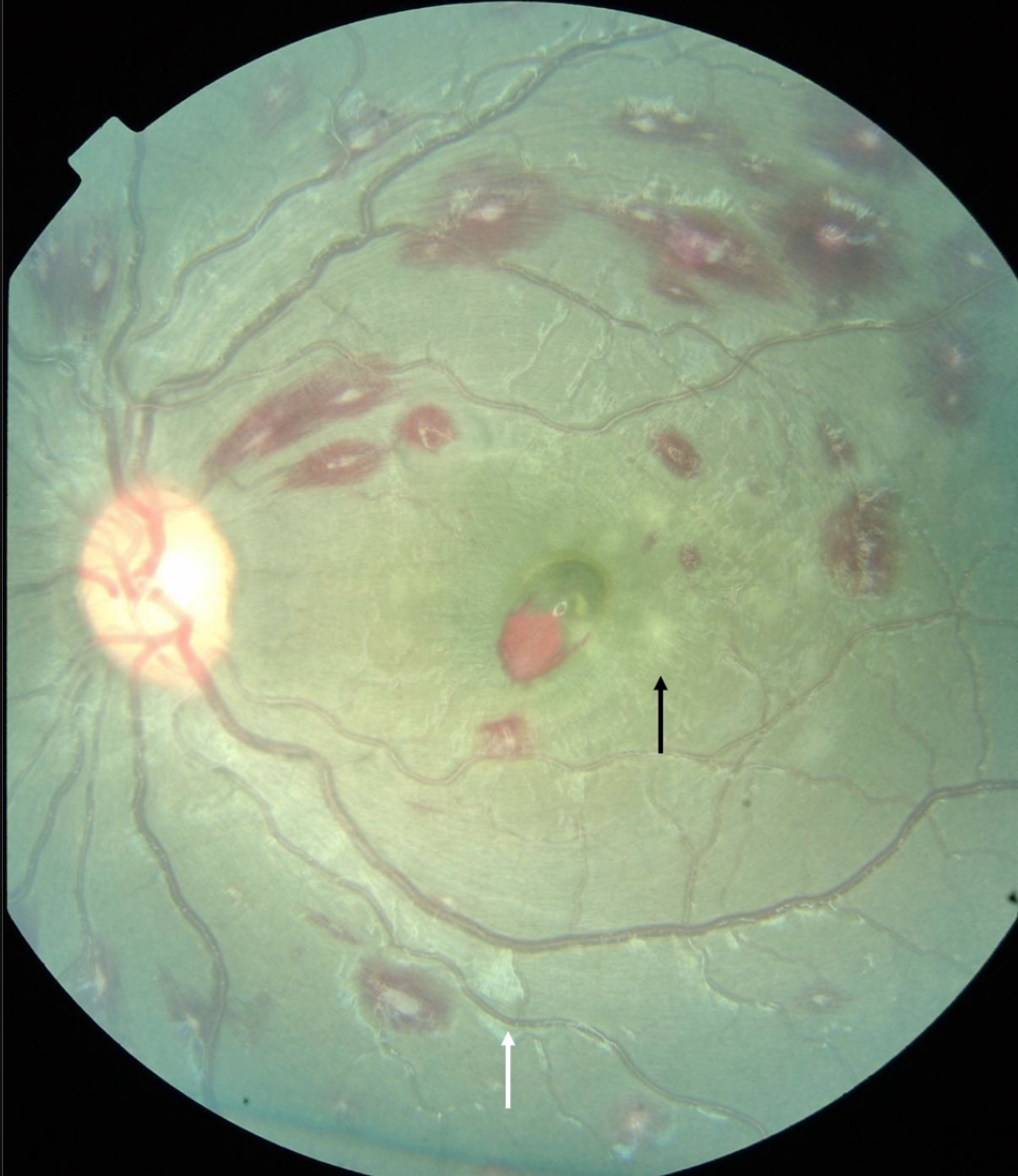 white-centred haemorrhages, a superficial blot haemorrhage at the fovea, mild macular whitening (black arrow) and cotton wool spot (white arrow)