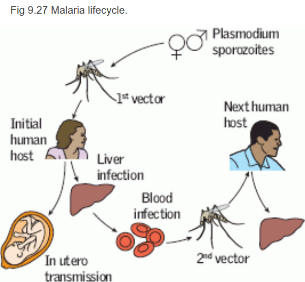 Plasmodium transmitted through female Anopheles mosquitoes: Plasmodium: falciparum (most common), vivax, ovale, malariae, and knowlesi.