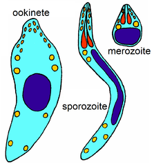 Após entrarem no vetor, os gametócitos se fertilizam, formando um zigoto, que logo se transforma em oocineto e adentra o epitélio intestinal do Anopheles, Dentro dessa camada epitelial, ele se encista, virando o oocisto. De oocisto, se transforma em vários esporozoítos, os quais são passados ao humano durante o repasto sanguíneo