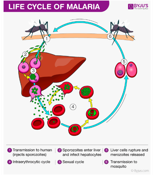 In red blood cells, the merozoites reproduce, after which the red blood cells rupture, releasing loads more merozoites into the blood and causing haemolytic anaemia.