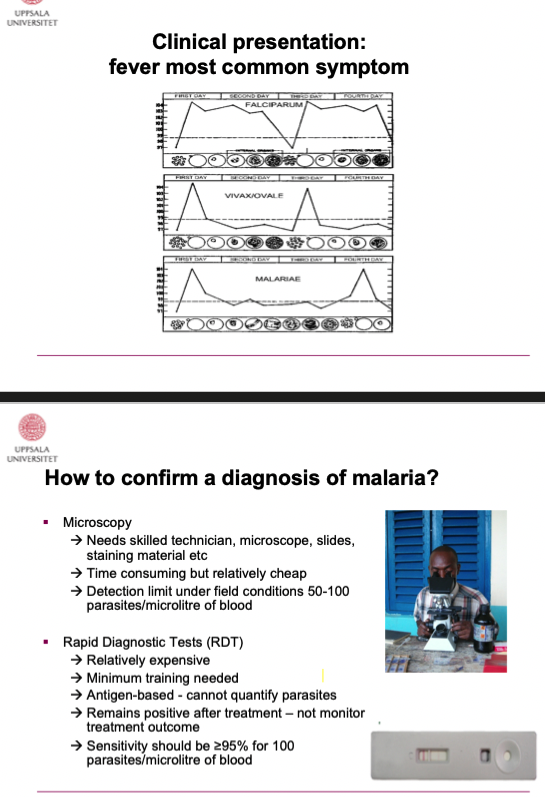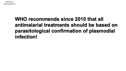 - Man kan inte monitorera behandlingseffekt pga positiv även efter behandling. Om man får feber igen efter en behandling - ja, du kan ha malaria men testet värdelöst för kommer va positivt ändå 4-6 veckor efter infektionen