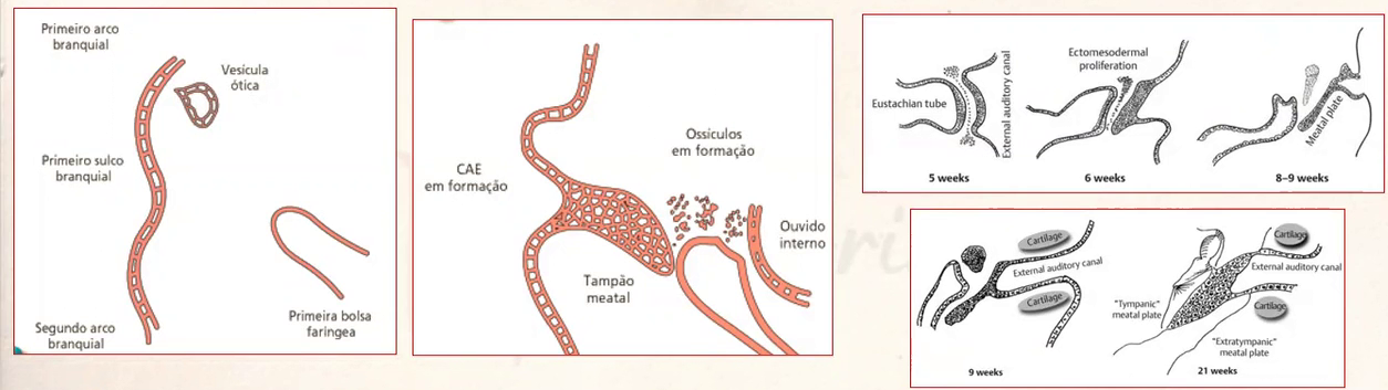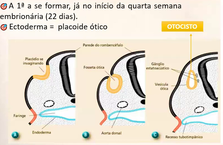 A orelha interna é a PRIMEIRA a se formar, logo na 4ª semana. Vem do placoide ótico, originada do ECTODERMA, que gera a vesícula ótica e depois otocisto, gerando utrículo (forma os canais semicirculares) e sáculo (forma a cóclea).
