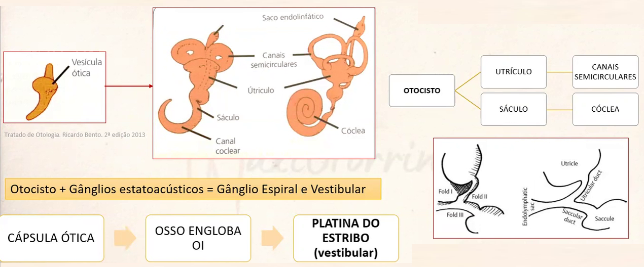 O otocisto é que forma a cápsula óptica (osso que engloba toda a orelha interna) e vai formar a porção da platina voltada pra janela oval (origem no ECTODERMA). Porém sua parte timpânica e também a sua supraestrutura será formada pelo segundo arco (MESODERMA). Isso explica porque a otoesclerose acomete a cápsula óptica e não acomete os ossículos (pega apenas porção próxima à janela oval, fixando a platina do estribo).