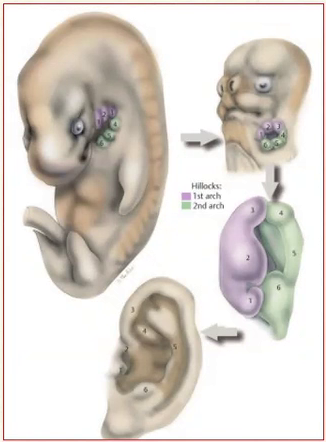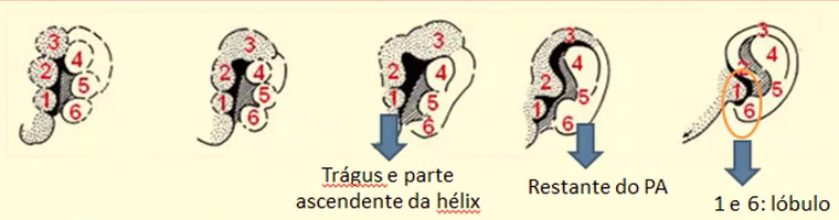 O primeiro e segundo arco (MESODERMA) vão formar o pavilhão auricular por meio de 6 tubérculos de His. O 1º arco (tubérculos 1,2,3) forma o tragus e parte ascendente da hélix e o 2º arco (tubérculos 4,5,6) forma o restante do pavilhão. Só lembrar da primeira metade e segunda metade. O lóbulo é formado pelo primeiro e sexto tubérculo.
