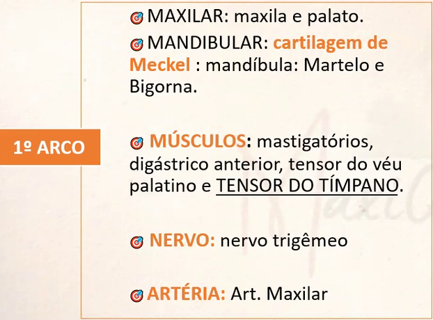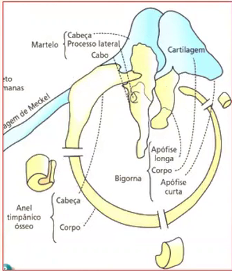 1º Arco = Cartilagem de Meckel, que forma MARTELO e BIGORNA.