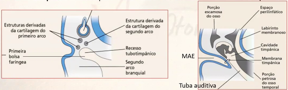 A 1ª bolsa (ENDODERMA) os origina. O recesso tubotimpânico migra para o espaço onde estão aparecendo os ossículos, juntamente com seus tendôes e forma a tuba auditiva (região proximal) e membrana no tímpano (distal). Por volta do terceiro e sétimo mês o endoderma também forma o revestimento mucoso de toda caixa timpânica e antro da mastóide e começa a formar compartimentos na orelha média, chamadas de sacos (divididos por ligamentos, “folds”).