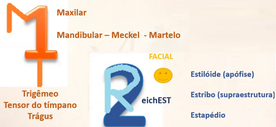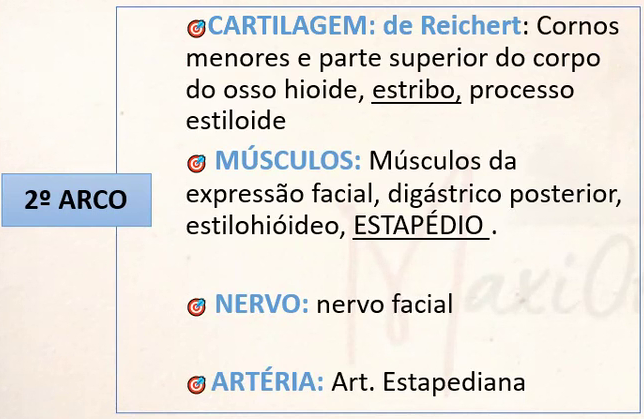 2º Arco = Cartilagem de Reichert, que forma a SUPRAESTRUTURA DO ESTRIBO e a PARTE TIMPÂNICA DA PLATINA..