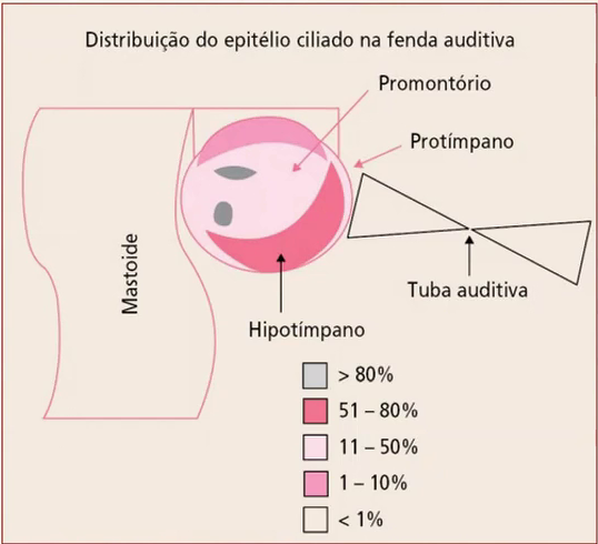 A membrana timpânica é desprovida de epitélio ciliado. A cavidade mastoidea e aditus apresentam, porém quantidades escassas. Na região do hipotímpano temos bastante epitélio ciliado e secretor (diferentemente da mastóide). A tuba apresenta em sua porção óssea células pseudoestratificadas ciliadas que reduzem ao se aproximar da cavidade timpânica. Já na sua porção cartilaginosa (voltada pra rinofaringe) possui epitélio respiratório (pseudoestratificado com células caliciformes e glândulas submucosas).