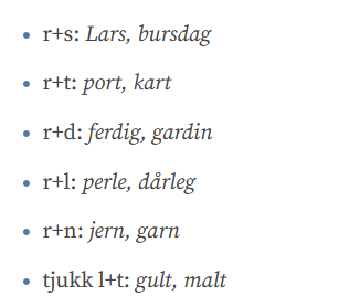 1.Tonegang, 2. Tjukk l, 3. Skarre-r, 4. Palatalisering, 5. Nektingsadverbet ikk