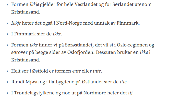 En annen god dialektmarkør er nektingsadverbet “ikke”. Ordet blir uttalt ganske ulikt i de forskjellige delene av landet.