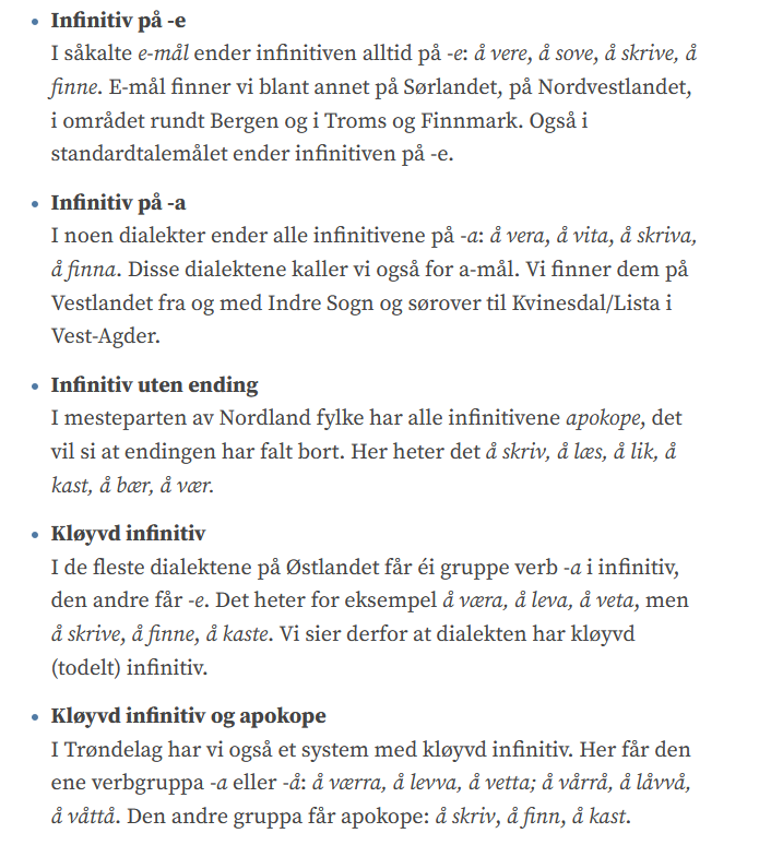I noen dialekter ender alle infinitivene på -a: å vera, å vita, å skriva, å finna. Disse dialektene kaller vi også for a-mål. Vi finner dem på Vestlandet fra og med Indre Sogn og sørover til Kvinesdal/Lista i Vest-Agder.