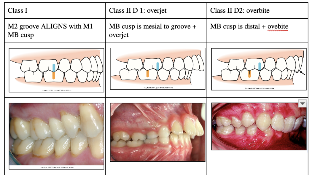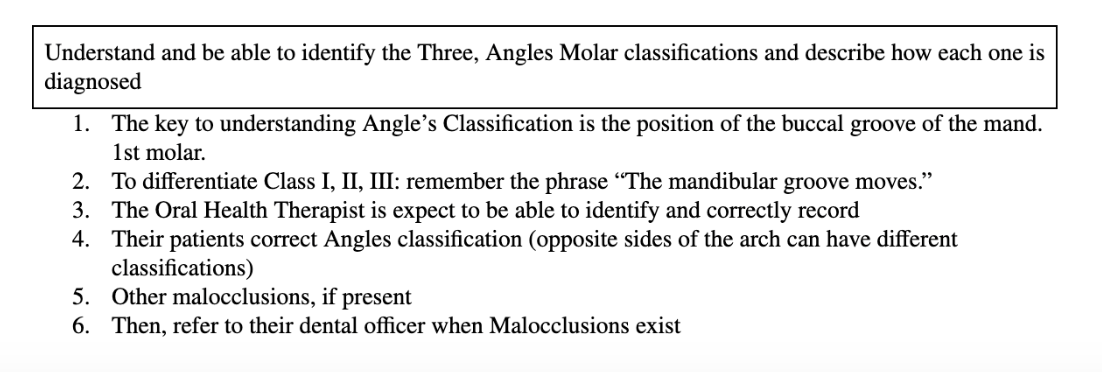 Understand and be able to identify the Three, Angles Molar classifications and describe how each one is diagnosed
