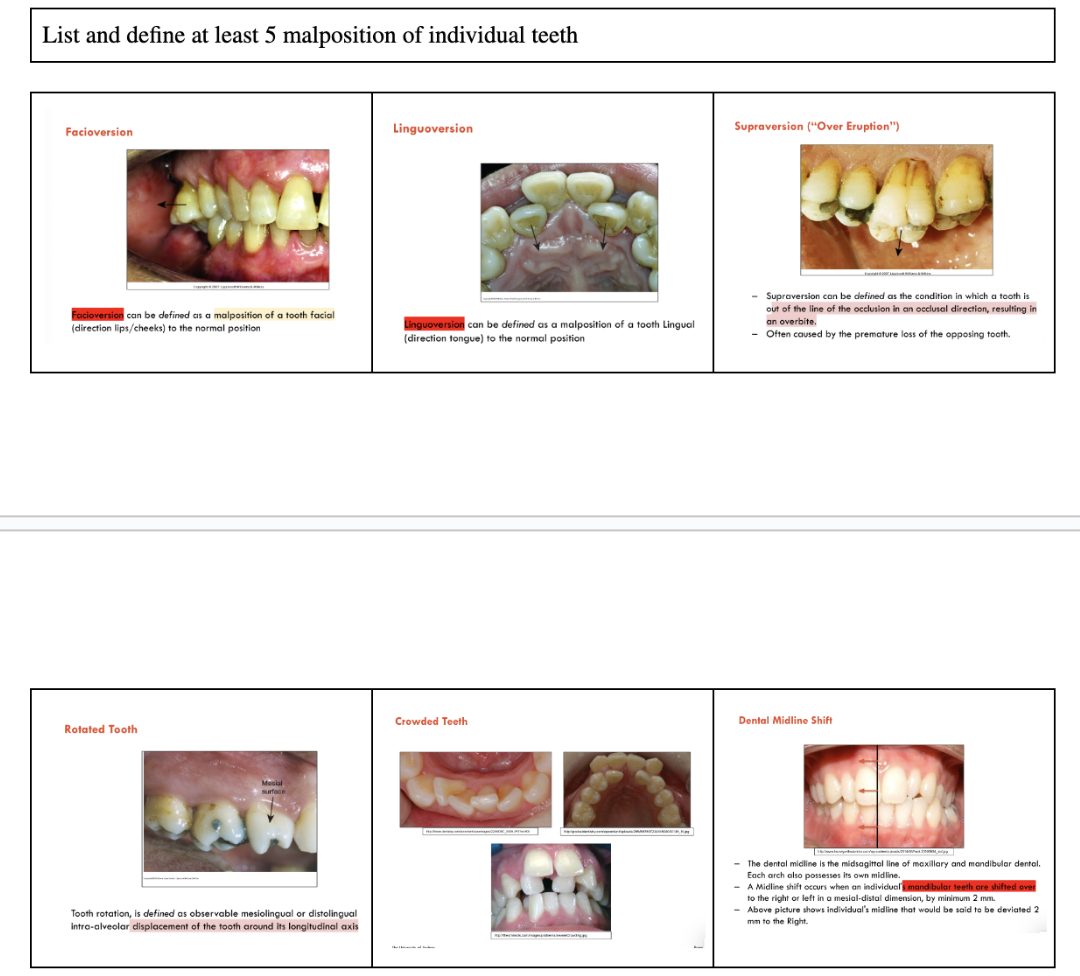 List and define at least 5 malposition of individual teeth