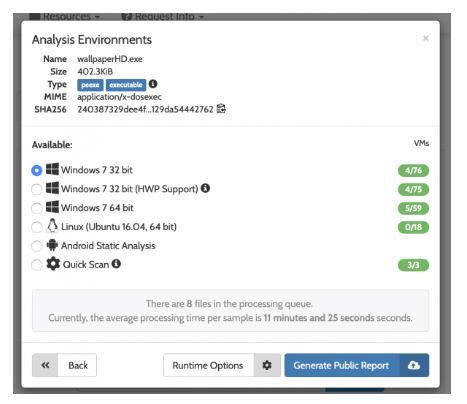 Next, you can choose the operating system that you want to detonate the malware on – this is perfect for malware that only targets specific operating systems. For this activity, we’ll just use the default Windows virtual machine.
