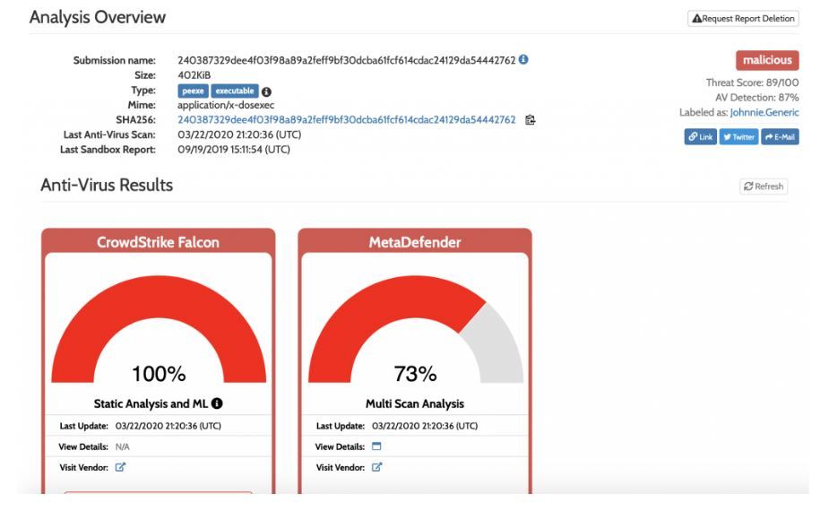 Hybrid Analysis is an online malware analysis platform that lets you upload malware for instant cloud-based analysis, providing you with a detailed report about the observed activity.