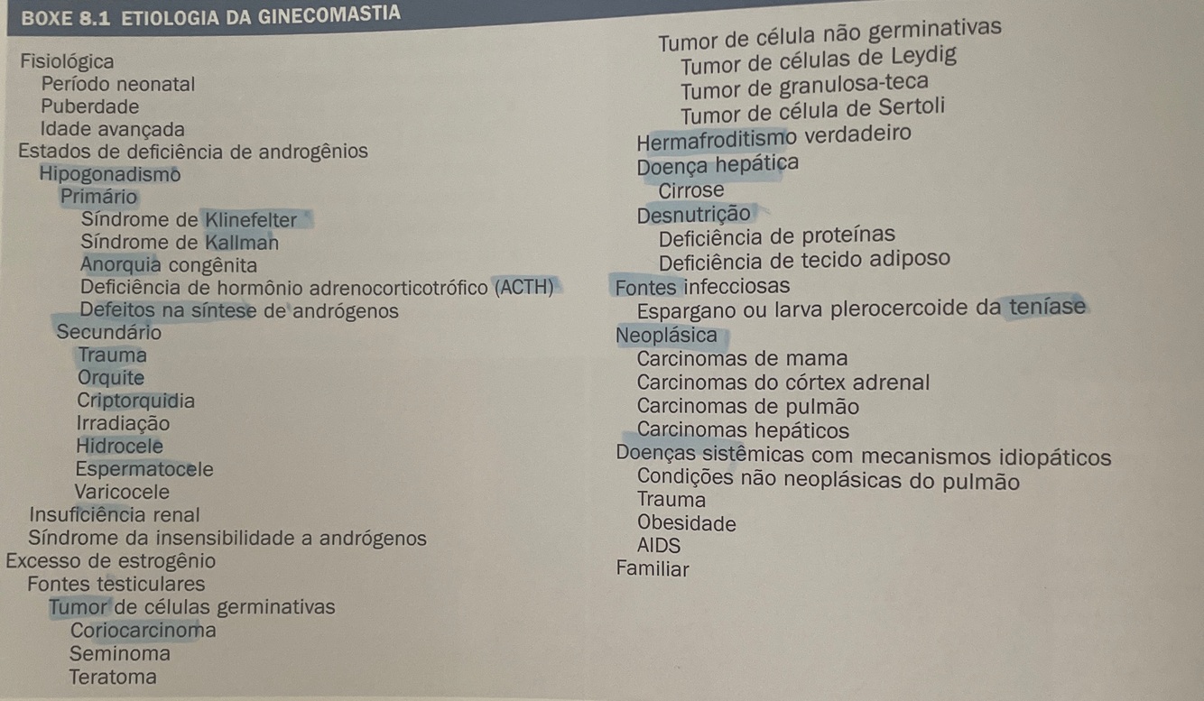 Condições: hipogonadismo, excesso estrogênio, neoplasia, trauma obesidade