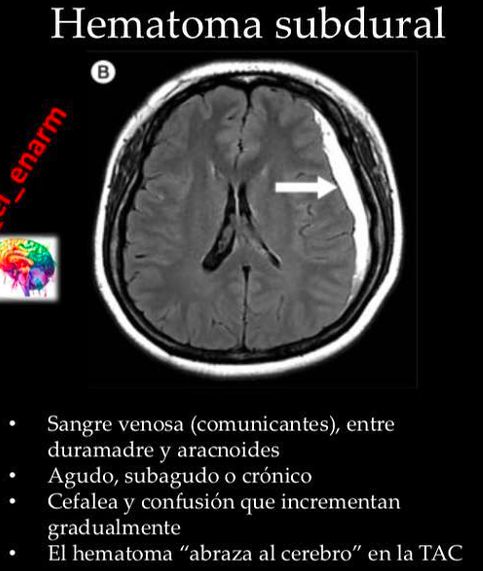Tipo de hematoma que está debajo de la duramadre y se distribuye “como plátano”