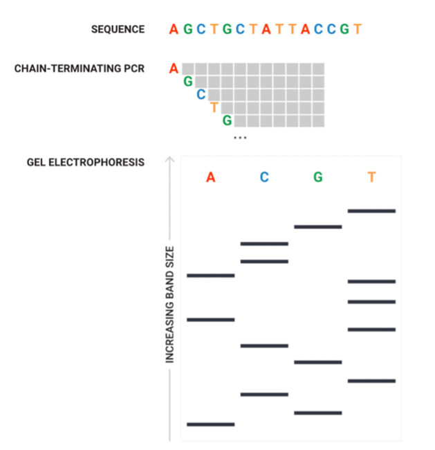 fragment that consists of only one nucleotide will travel all the way to the bottom of the gel, and every band above this on the gel represents the addition of one more base