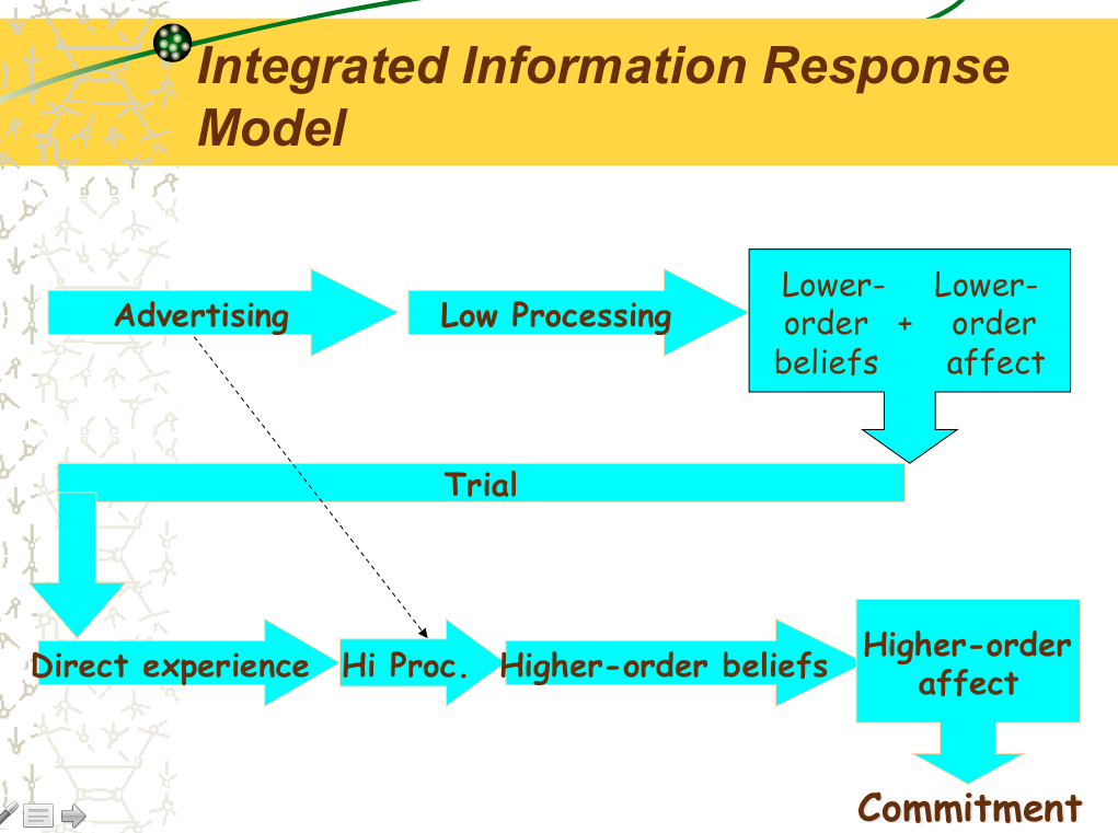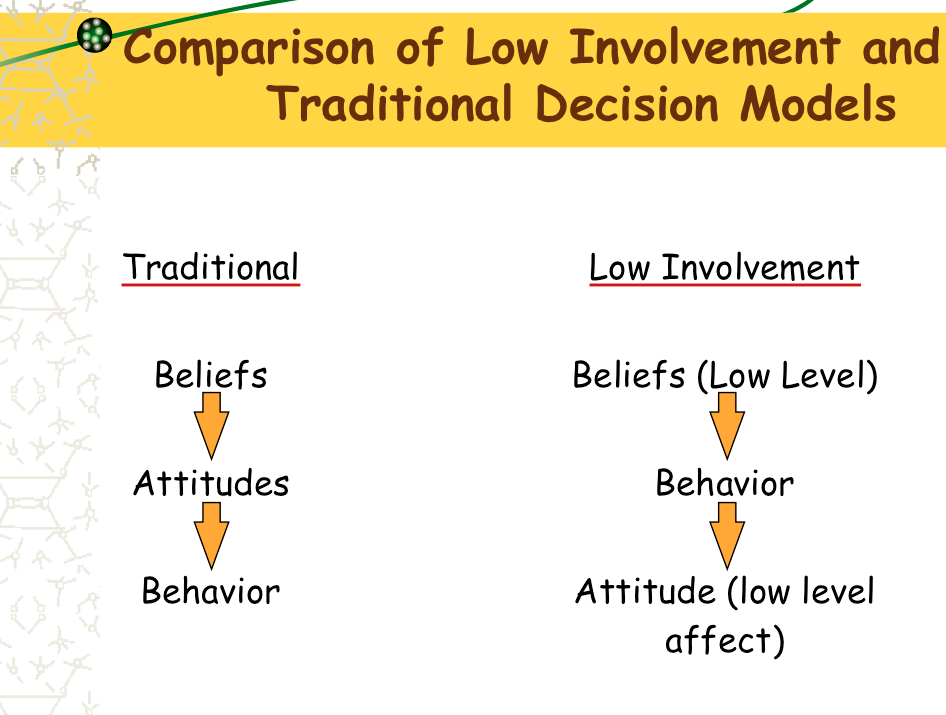 Hard to change beliefs and attitude toward brand (low level of processing)