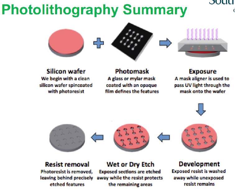 The first step is photolithography: photoresist is spun on the wafer, mask is applied with UV light. Then the wafer is put into a developer to remove the exposed parts of the photoresist. Then your circuits are etched. After that the photoresist is removed and then silicon dioxide deposited by PECVD. After that the wafer is diced and chips cleaned.
